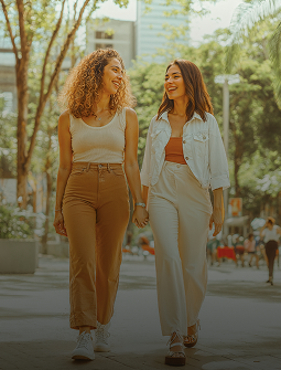 Casal ao por do sol em uma praça com prédios ao fundo Selo HIS